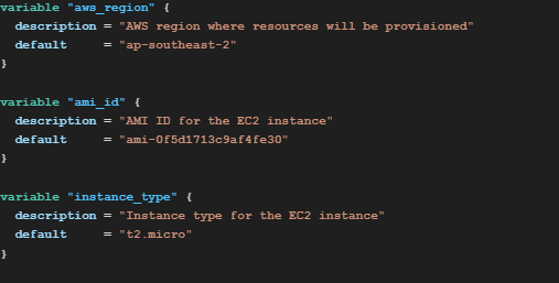 When you declare variables in the root module of your configuration, you can set their values using CLI options and environment variables. As you can see in the images, i am using in Sydney region and default EC2 instance i am using is Ubuntu of sydeny area and t2.micro as a processor.