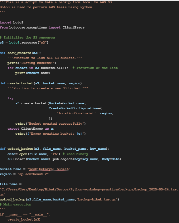 Now its time to write code to upload the given path backup tar file in the default bucket_name listed in ap-southeast-2 region.