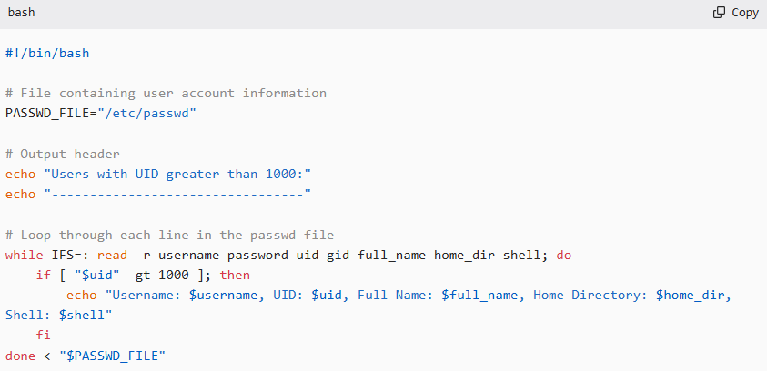 - The script checks if the UID is greater than 1000. If true, it prints the user’s information.